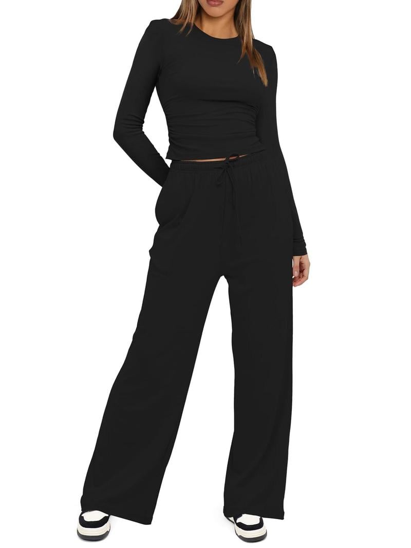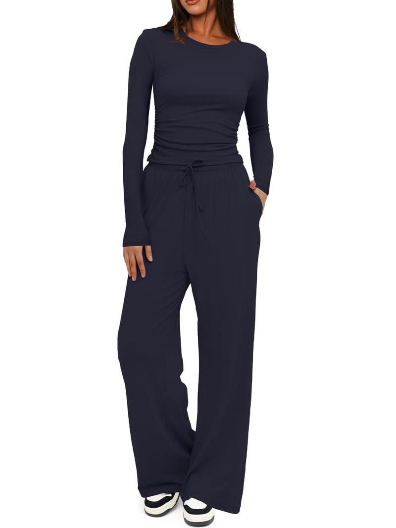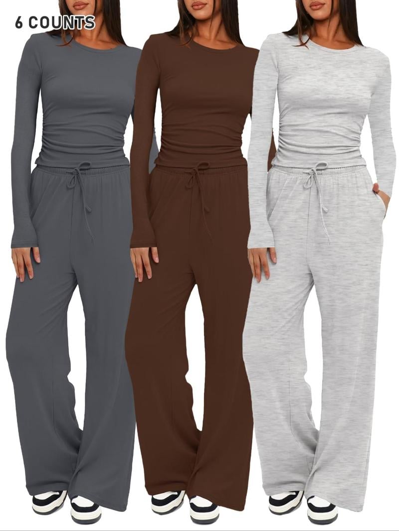 Two-piece Set Women's Solid Ruched Tee & Drawstring Pocket Pants Lounge Set, Casual Long Sleeve T-shirt & Elastic Waist Trousers, Ladies Sleepwear for All Seasons!