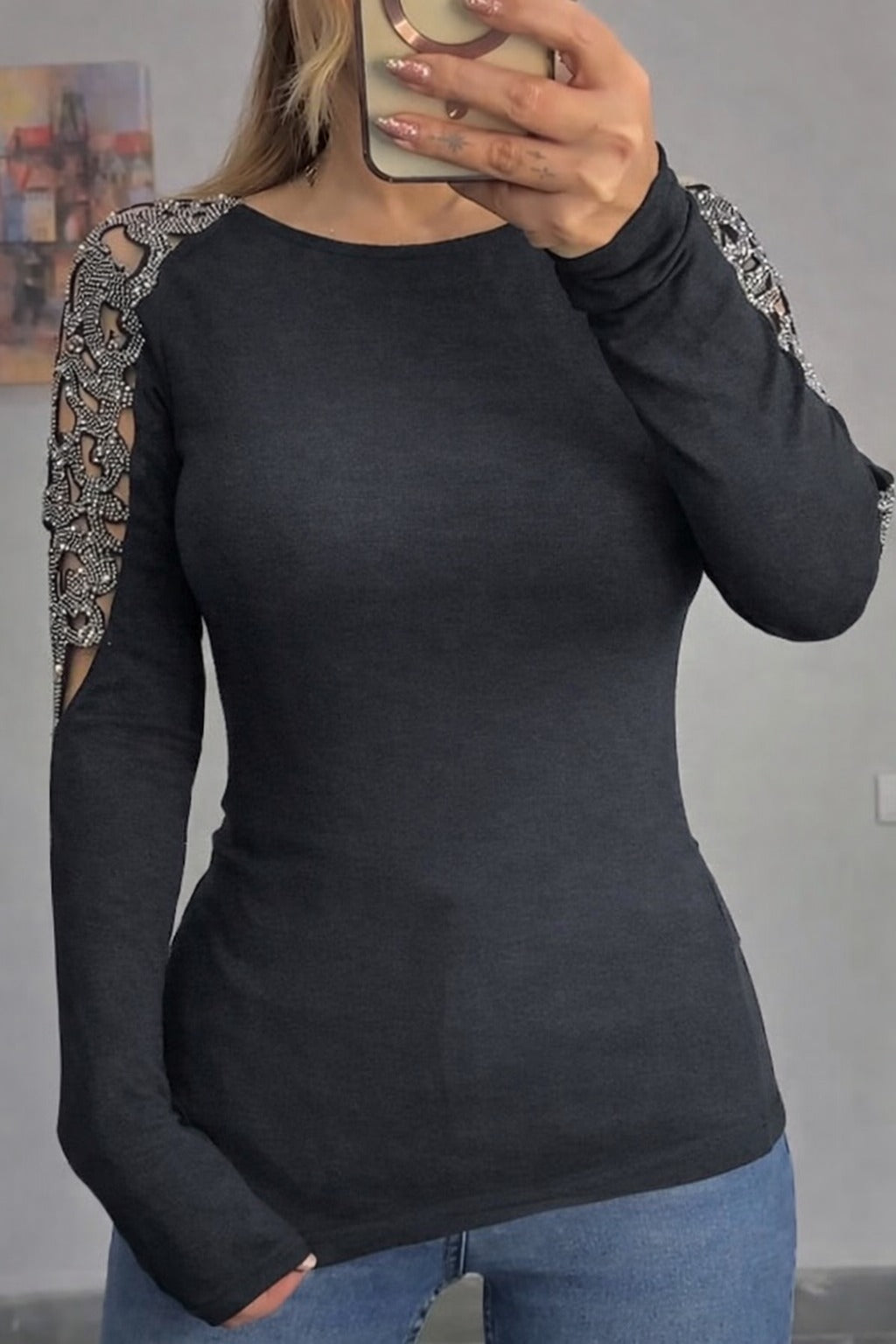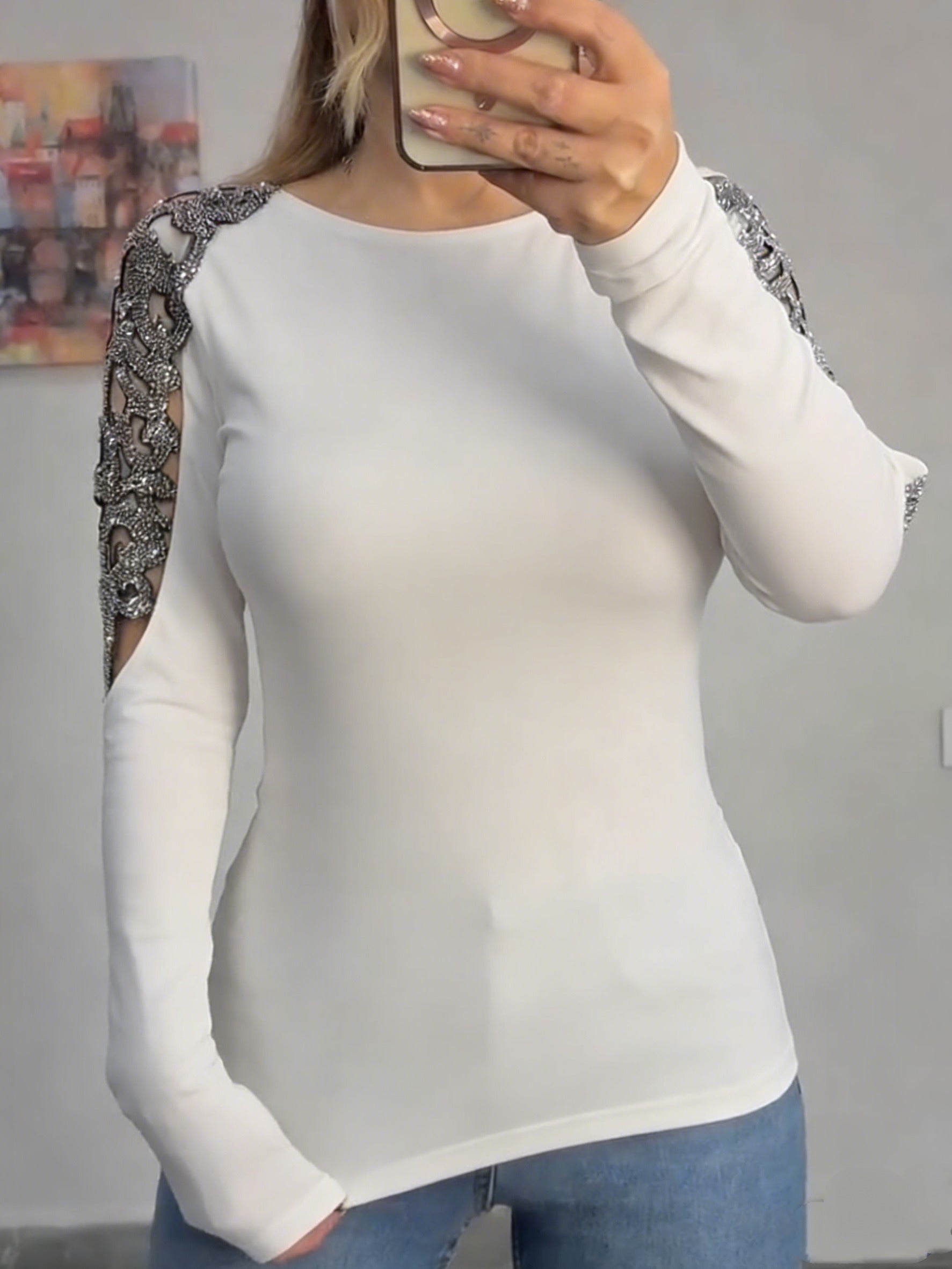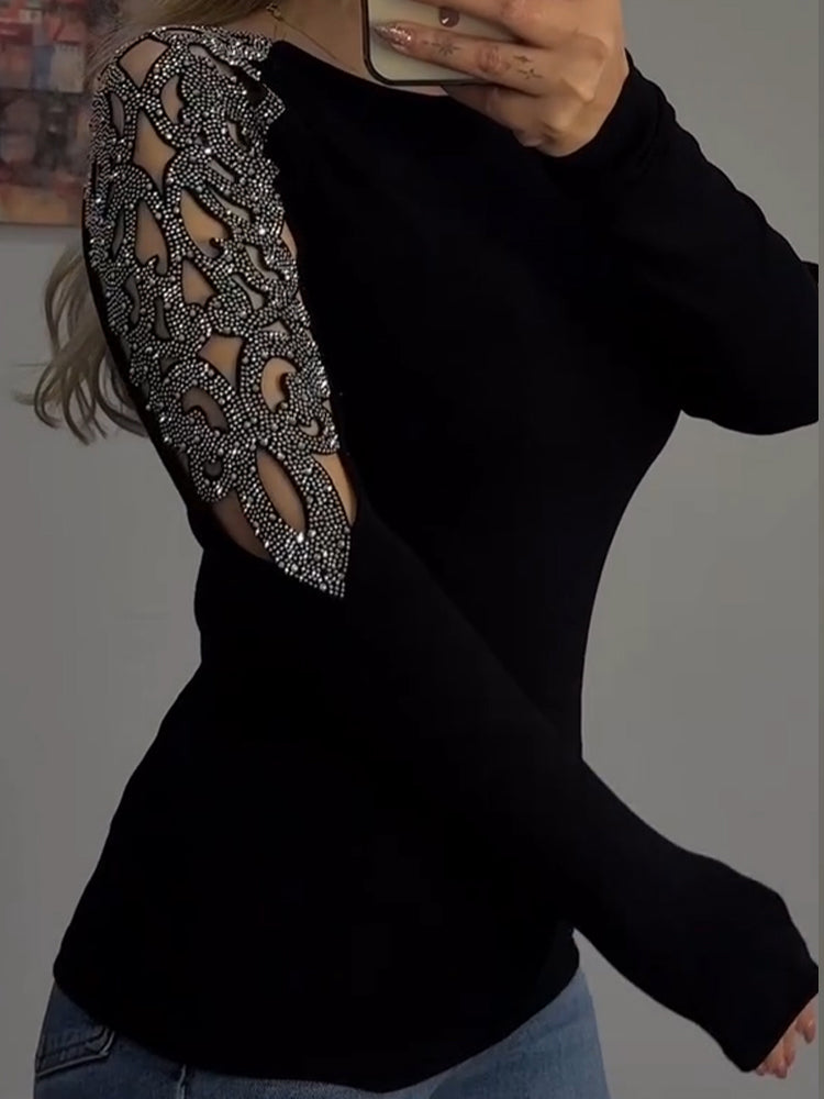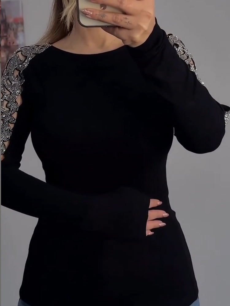 • Women Round Neck Sleeves Hollowed Out Hot Stamping Rhinestone Casual Top