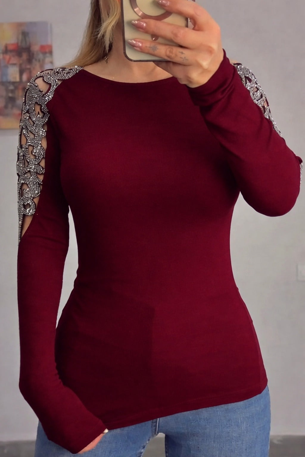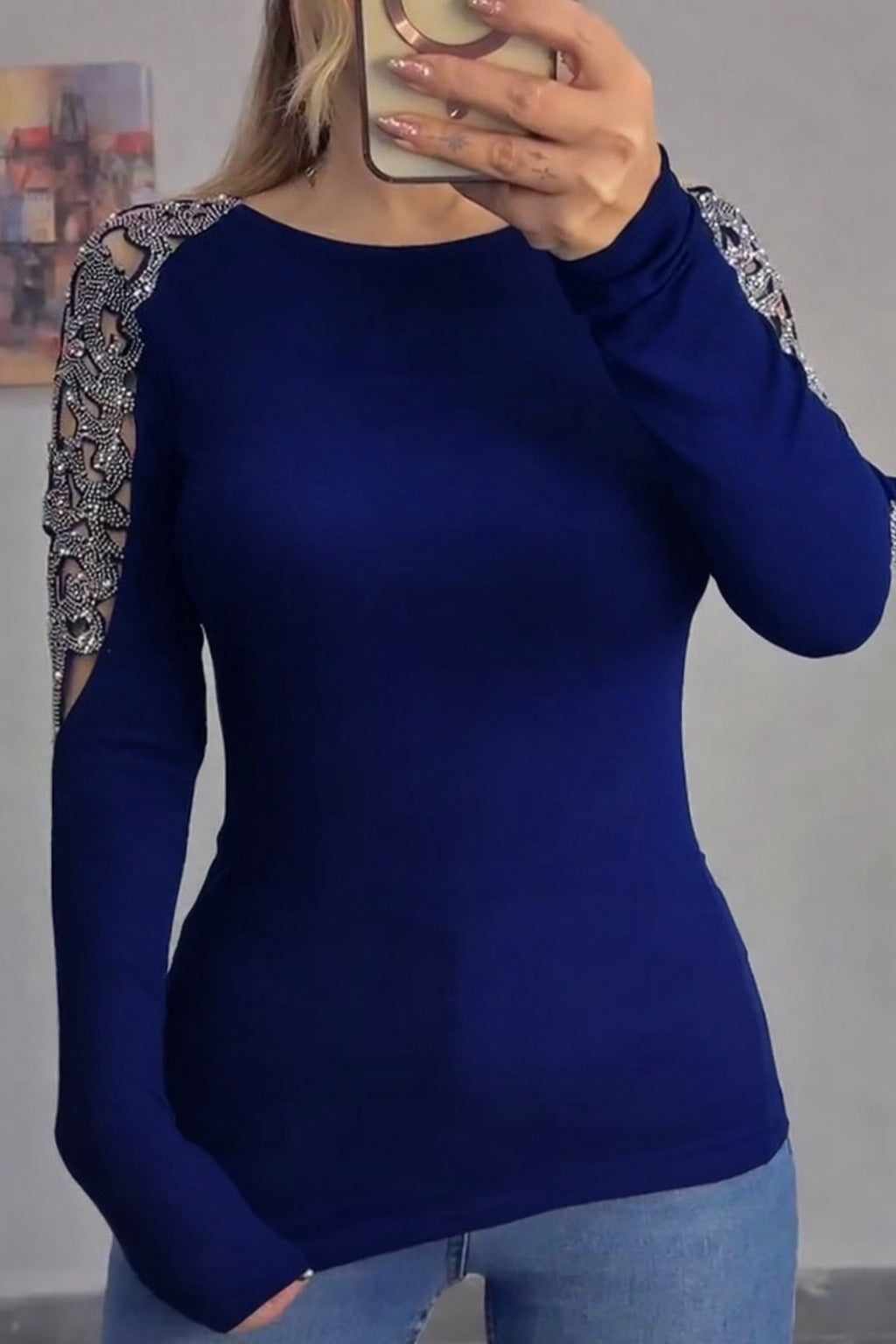 Women Round Neck Sleeves Hollowed Out Hot Stamping Rhinestone Casual Top